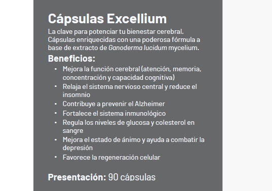 Algunas cosas en la naturaleza sólo hacen grandiosos alimentos para la mente. Por lo tanto, nuestro equipo de desarrollo del producto ha creado una clase muy especial de “alimento para la mente” que es tan puro como es puramente eficaz. Usando la parte del micelio del hongo, se encontró que el Excellium contiene vitaminas, minerales, proteínas, enzimas y aminoácidos, que pueden mejorar con eficacia la función cerebral, y producir la stamina mental que usted necesita para resistir un largo día. Y es excelente para niños y adultos. Combinado con el Ganoderma de Gano iTouch, el Excellium trabaja sinérgicamente para convertirse en lo que muchos creen que es el mejor tándem en el cuerpo y mente de nutrición en la actualidad. (90 Capsulas)